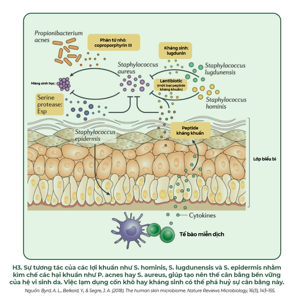 - Song song đó, việc duy trì một môi trường da khỏe mạnh (đủ ẩm, đủ lipid, độ pH cân bằng) chính là một hành động nuôi dưỡng hệ vi sinh vật. Môi trường này sẽ tạo điều kiện cho các chủng lợi khuẩn có cơ hội phát triển trở lại, cạnh tranh và lấn át các vi khuẩn gây hại, dần dần tái lập lại trạng thái cân bằng sinh học (eubiosis).