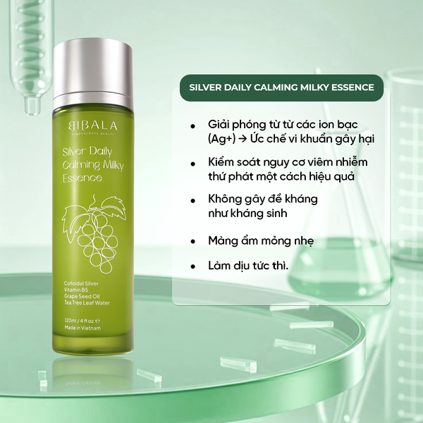 - Hành động: Đưa vào quy trình sản phẩm Silver Daily Calming Milky Essence. Công nghệ keo bạc nano giải phóng từ từ các ion bạc (Ag+), có khả năng ức chế enzyme hô hấp và sao chép DNA của vi khuẩn gây hại, giúp kiểm soát nguy cơ viêm nhiễm thứ phát một cách hiệu quả mà không gây đề kháng như kháng sinh. Kết cấu dạng sữa lỏng còn cung cấp một lớp màng ẩm mỏng nhẹ, làm dịu tức thì.