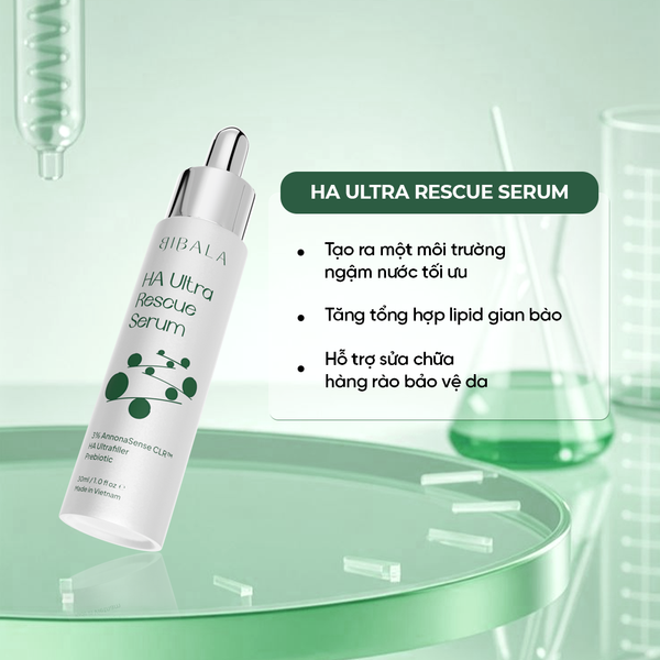 - Nếu da đã ổn định, có thể bắt đầu đưa HA Ultra Rescue Serum vào chu trình với tần suất thấp (cách ngày) và lượng nhỏ để kiểm tra độ dung nạp. Việc bổ sung HA và các yếu tố giữ ẩm tự nhiên (NMF) sẽ tạo ra một môi trường ngậm nước tối ưu, là điều kiện cần thiết cho các enzyme tham gia vào quá trình tổng hợp ceramide và sửa chữa hàng rào hoạt động hiệu quả.