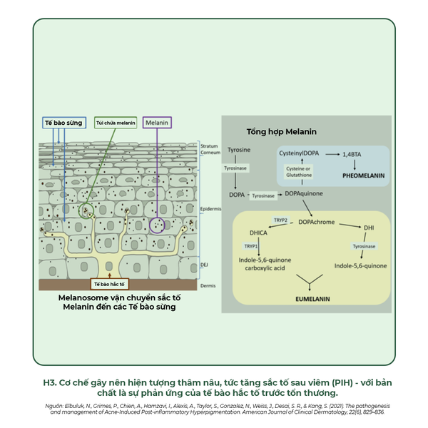 PIH là những đốm phẳng có màu từ nâu nhạt đến nâu sẫm hoặc xám. Trái ngược với PIE, nguyên nhân của PIH hoàn toàn liên quan đến sắc tố. Các nghiên cứu đã chỉ ra rằng, phản ứng viêm đã kích hoạt các tế bào hắc tố dưới da sản xuất melanin một cách quá mức. Lượng melanin dư thừa này sau đó bị “rơi vãi” và tích tụ bất thường trong các tế bào biểu bì hoặc lắng đọng sâu hơn ở lớp trung bì.