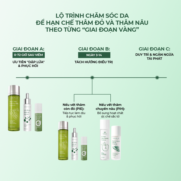 Đây là "thời điểm vàng" để ngăn chặn cả PIE và PIH. Mục tiêu chính là làm dịu viêm, giảm đỏ và bảo vệ hàng rào da đang tổn thương.