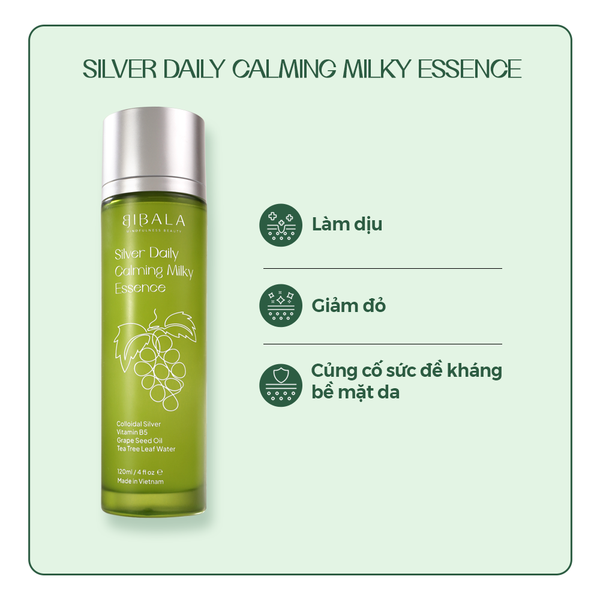 - Silver Daily Calming Milky Essence: Tổ hợp làm dịu, giảm đỏ, và củng cố sức đề kháng bề mặt da (Zinc PCA, B5, TECA, nước lá tràm trà, keo bạc).