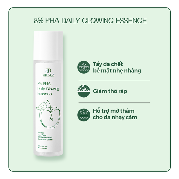 - 8% PHA Daily Glowing Essence: Tẩy da chết bề mặt nhẹ nhàng, giảm thô ráp và hỗ trợ mờ thâm cho da nhạy cảm.