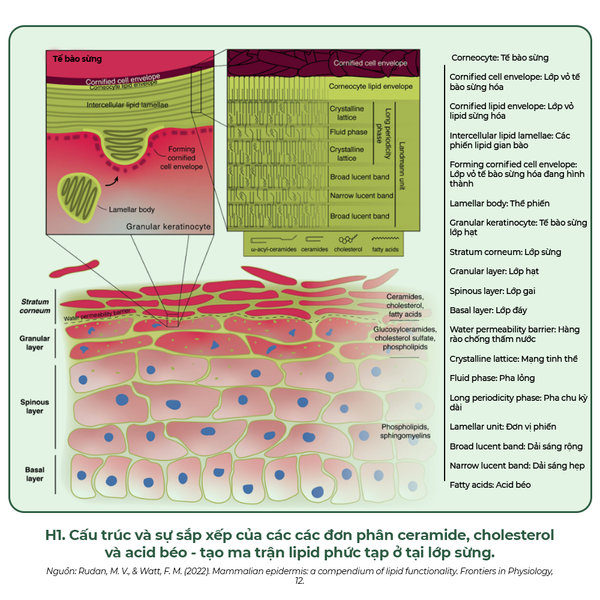 - Lớp “vữa” xi măng liên kết các tế bào sừng là một ma trận lipid phức hợp bao gồm ceramide, cholesterol và các acid béo tự do.