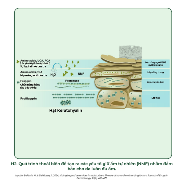 - Bên trong tế bào sừng, các yếu tố giữ ẩm tự nhiên (NMF) được sản sinh từ sự thoái biến của protein filaggrin, đóng vai trò như những phân tử ngậm nước, duy trì độ ẩm cần thiết.