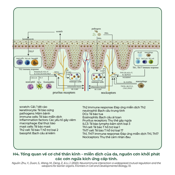 Các phân tử này hoạt động như những tín hiệu báo động, trực tiếp kích hoạt các tế bào miễn dịch tại da, đặc biệt là tế bào mast. Tế bào mast bị kích hoạt sẽ “vỡ” ra, giải phóng hàng loạt các chất trung gian gây viêm, điển hình là histamine và Interleukin-31 (IL-31). IL-31 được mệnh danh là “cytokine gây ngứa”, vì nó tác động trực tiếp lên các thụ thể thần kinh, tạo ra cảm giác ngứa ngáy và châm chích.